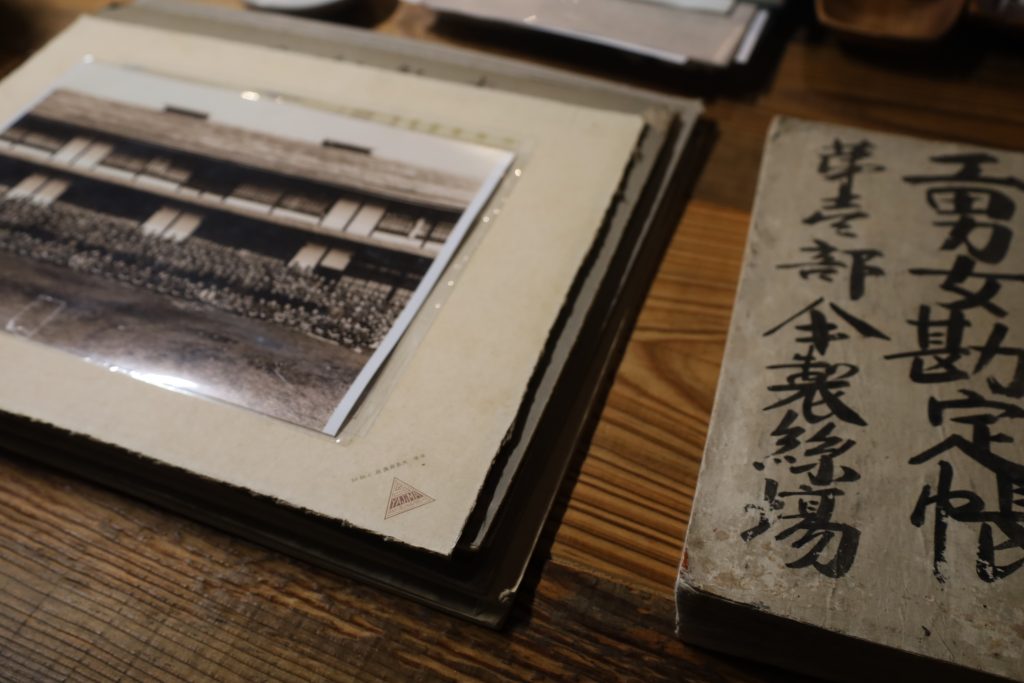 この蔵のある夫の実家は、昭和初期まで「東英社ヤマキ製糸場」という製糸工場を営んでいました。この家に私がきたときには既に製糸工場は閉業していましたが、この蔵の中には当時を伝える資料がぎっしりと詰まっていました。例えば、工女さんがたくさん映っている写真や、当時の糸や繭の取引の状況が記録されている帳簿、そして工女さんが工場で毎食ごはんを食べるために使っていた食器など、それはもうたくさん出てきました。