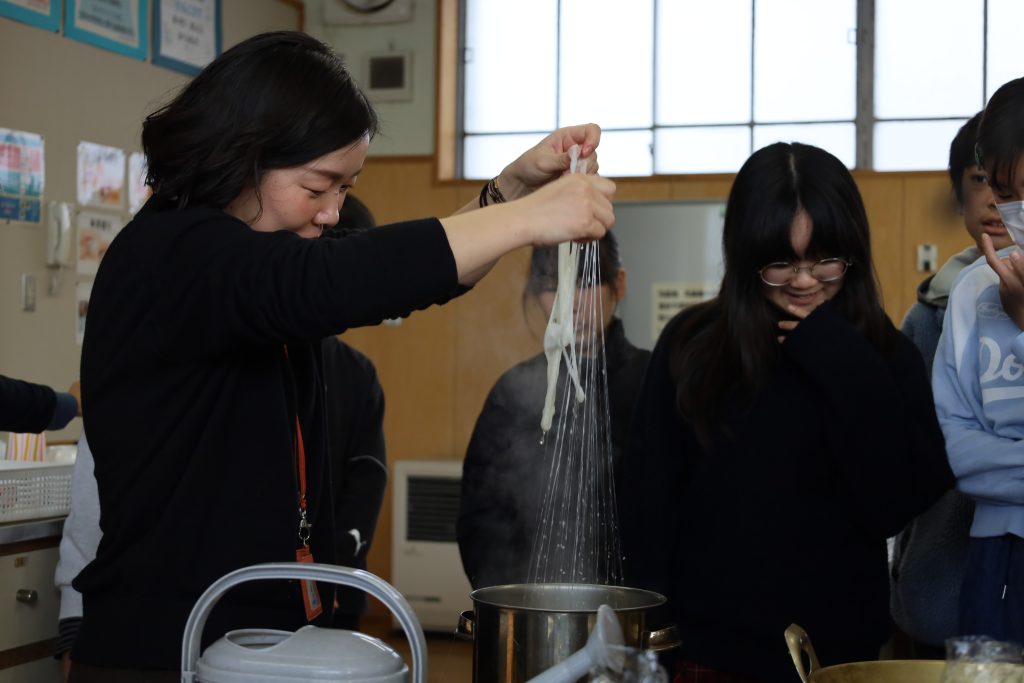適正な温度を測りながら丁寧に繭を煮ていくと、お湯の中で繭がふっくらとしてきます。繭を煮る匂いが教室中に立ち込めてくると、「ほうれん草が煮える匂いみたい!」「オクラをゆでたときの匂いかな」と匂いに気づいた生徒の皆さんが言葉にして教えてくれました。