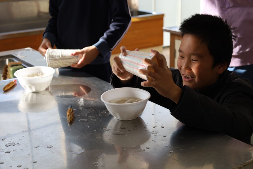 繭を煮るところから始まる、このランプシェードづくりの授業は1時間目から4時間目まで午前中いっぱい使って行われます。今回授業をする岡谷蚕糸博物館学芸員の森田さんともすでに何度も授業をともにしてきて慣れた雰囲気の中、この長大なカイコ学習の授業が始まりました。