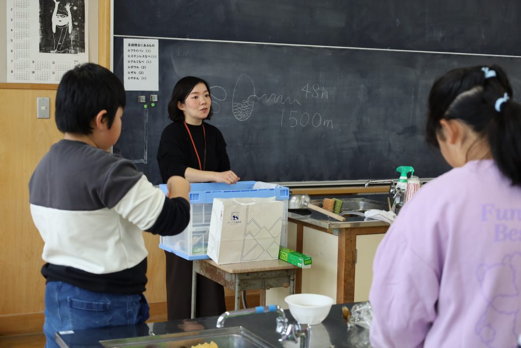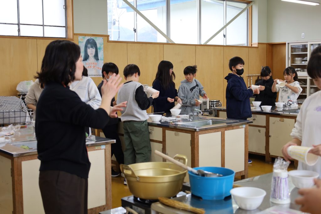 1時間目の授業は、自分たちが育てた繭を煮るところから始まります。良い糸をとるために重要となるのがこの繭を煮る技術ですが、製糸のまち岡谷にはこの煮繭の技術が昔から大切に育まれてきました。この日は、その煮繭のお手本を森田さんが見せてくれました。