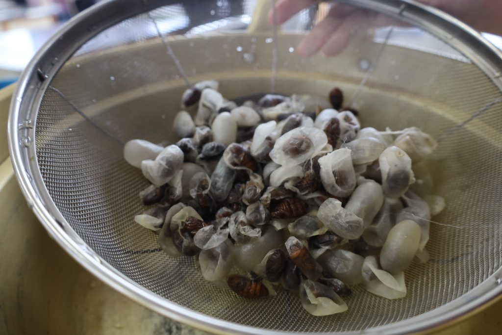 糸を取り切った繭の中には、お蚕さまのサナギと脱皮の抜け殻だけ残ります。こうして残ったサナギはその昔、佃煮や魚の餌に再利用されました。「命をいただいて最後まで大切に使いきる。蚕糸業とはそういうお仕事なのです」と森田さんが語るように、蚕糸業では脱皮の抜け殻以外はほぼ全て再利用され、お蚕さまが命をかけて生み出してくれたものが余すことなく活かされてきた歴史があります。