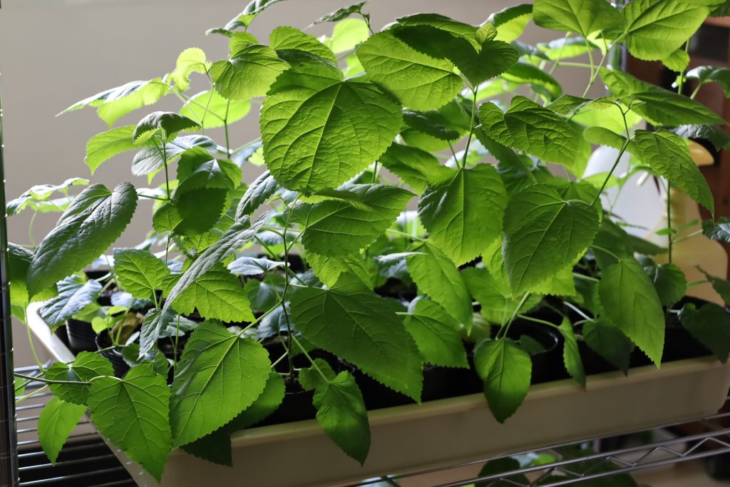 玄関前に並ぶ水耕栽培の苗から育った桑