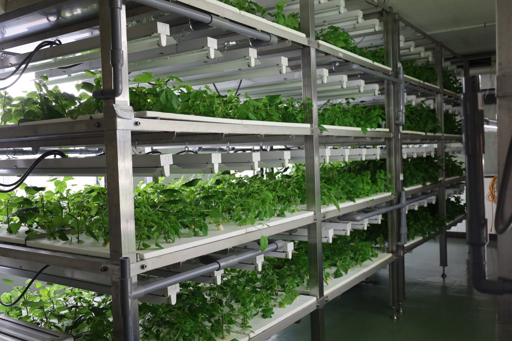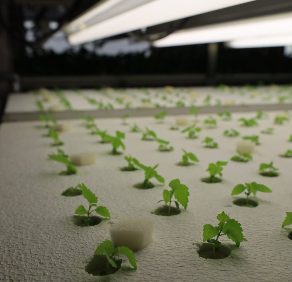 この工場内で、桑の種を栽培パレットに植え付け、約10~15センチ程度になるまで桑の苗は栽培されます。一定の大きさに育った苗は水耕栽培のできるビニールハウスに移植・定植され、より大きく成長を促していきます。