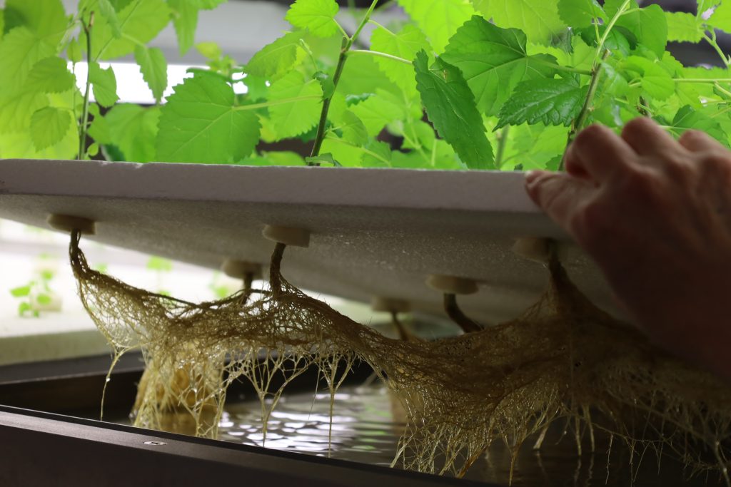 植物工場で桑の種が植え付けられている栽培パレットを持ち上げると、「ひげ根」と呼ばれる、細い毛細血管のような黄色い根が見えます。このひげ根は名前のとおり非常に細く繊細なため、屋外で栽培される桑からの収穫は困難ですが、屋内の衛生管理された環境で水耕栽培を行うことで収穫ができ、根の収穫と食品・化粧品への利用が可能になります。また、新潟薬科大学との共同研究によって、含まれる成分についても屋外栽培の桑は大きく異なり、屋内栽培の桑にはポリフェノールなどの成分がより豊富に含まれていることが明らかになりました。