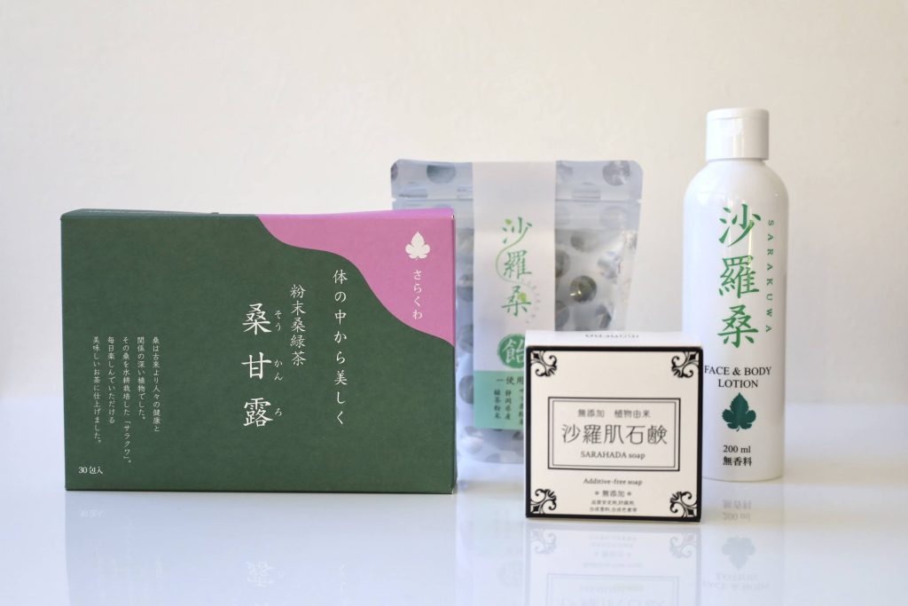この工場内で水耕栽培されたら桑は、収穫されたあとに洗浄・乾燥・粉砕され、お茶や飴などの食品、石鹸やローションなどの化粧品等に加工されていきます。ここからは、桑の葉や根から生み出された㈱モレラの商品を紹介していきます。