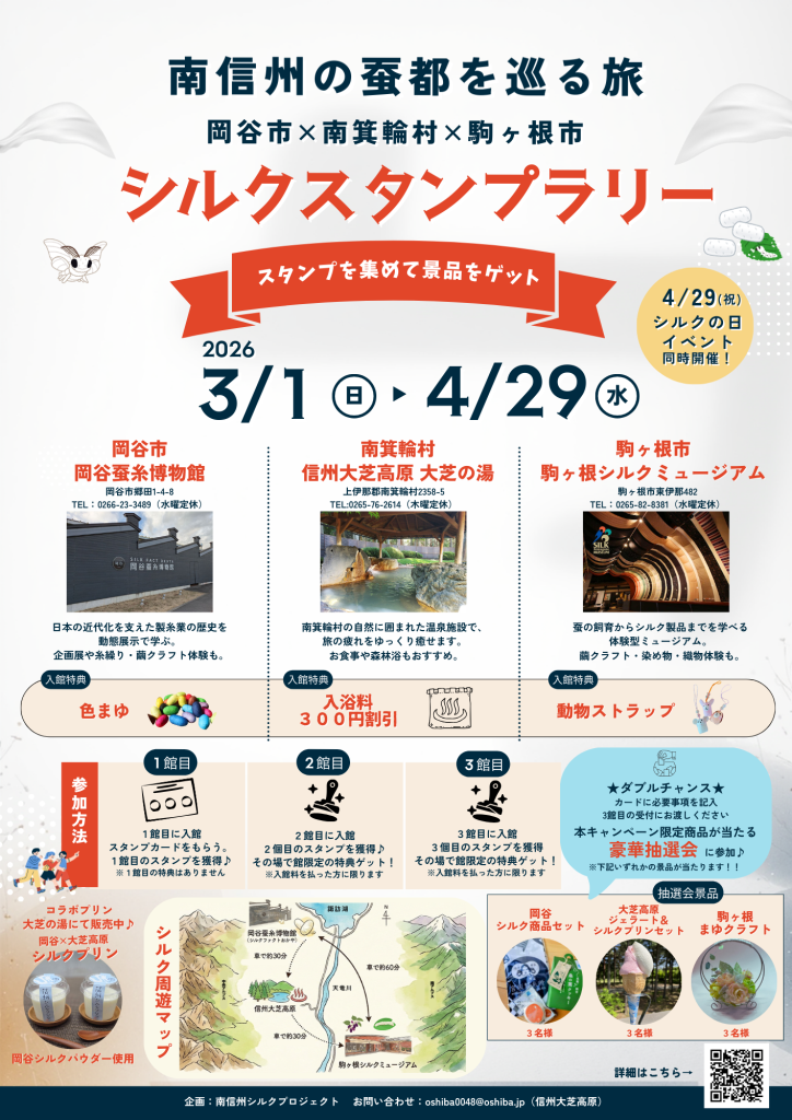 岡谷市・南箕輪村・駒ヶ根市を舞台に、蚕の歴史と魅力を体感しながら巡る「シルクスタンプラリー」を開催します。